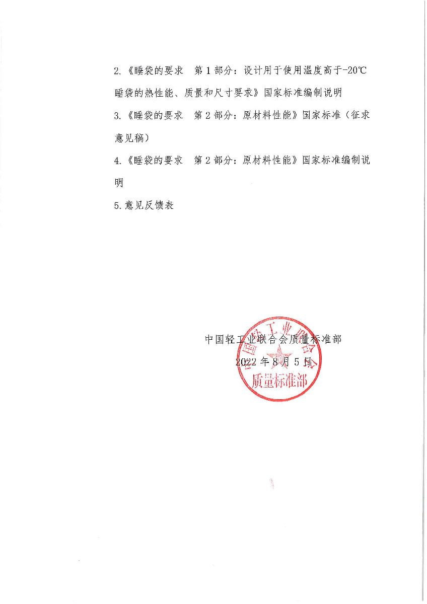 关于征求《睡袋的要求 第1部分:设计用于使用温度高于-20℃睡袋的热性能、质量和尺寸要求》等2项国家标准(征求意见稿)的通知