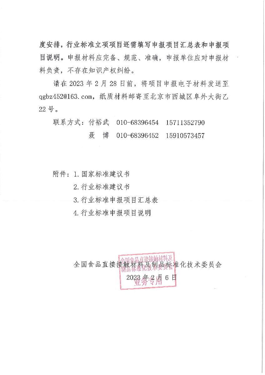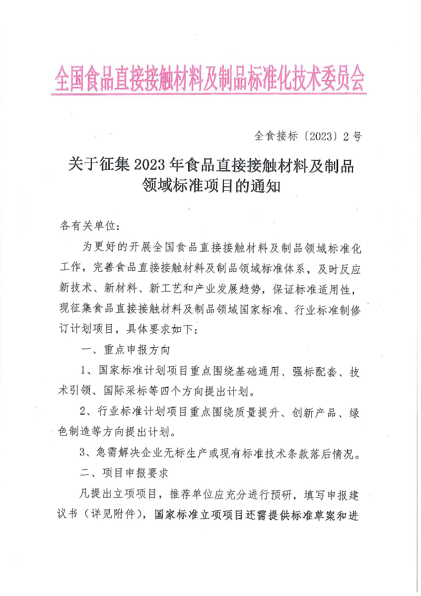 关于征集2023年食品直接接触材料及制品领域标准项目的通知