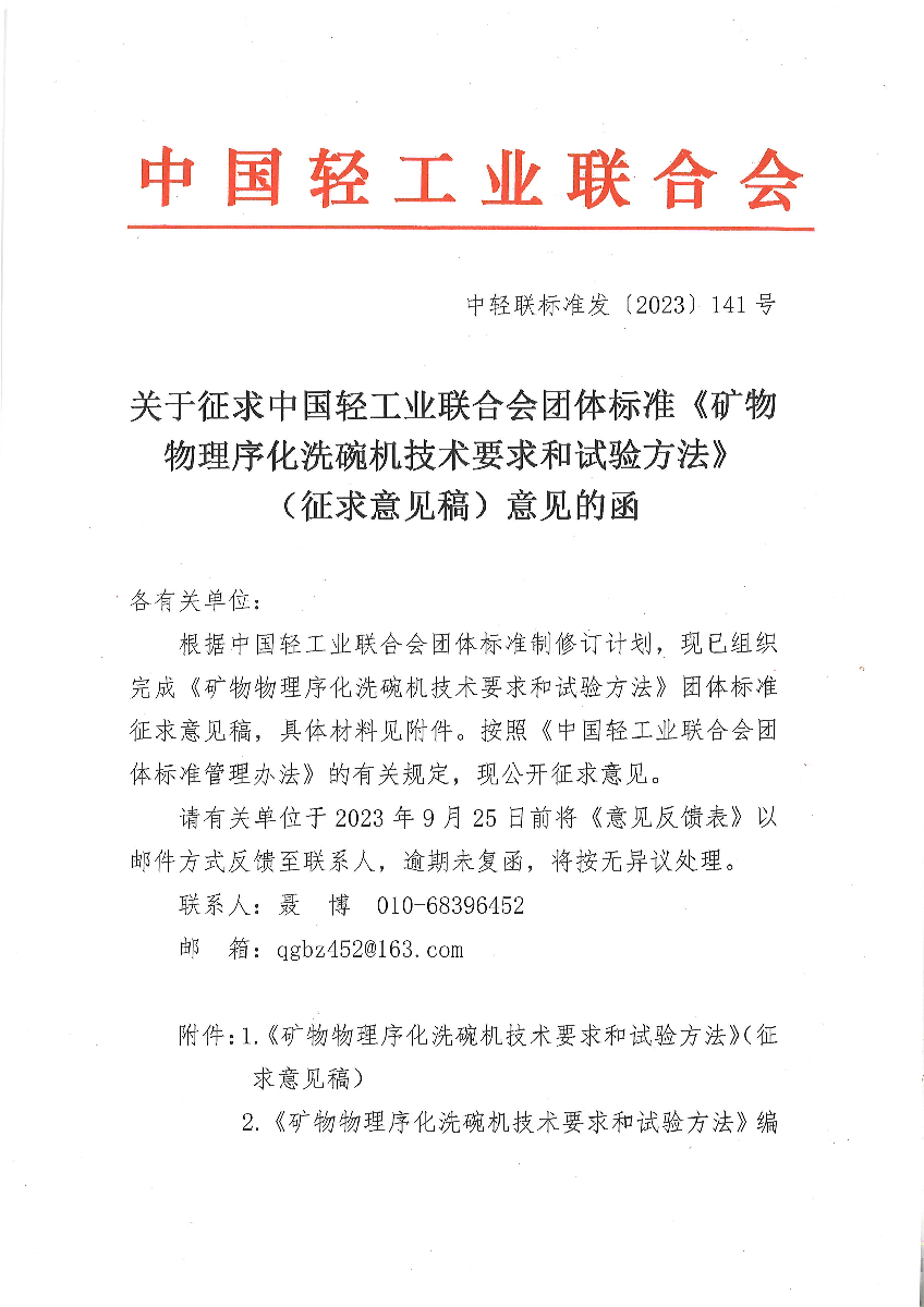 关于征求bv伟德国际体育1946团体标准《矿物物理序化洗碗机技术要求和试验方法》(征求意见稿)意见的函
