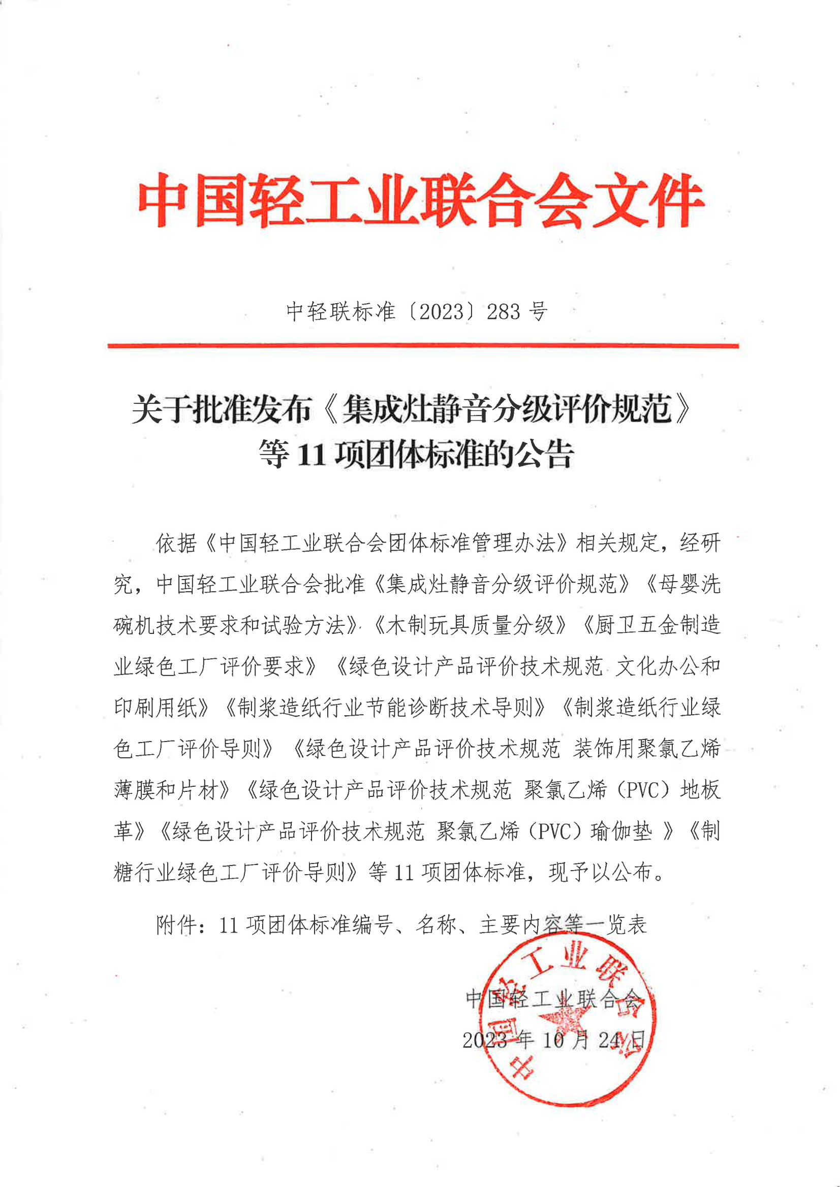 关于批准发布《集成灶静音分级评价规范》等11项团体标准的公告
