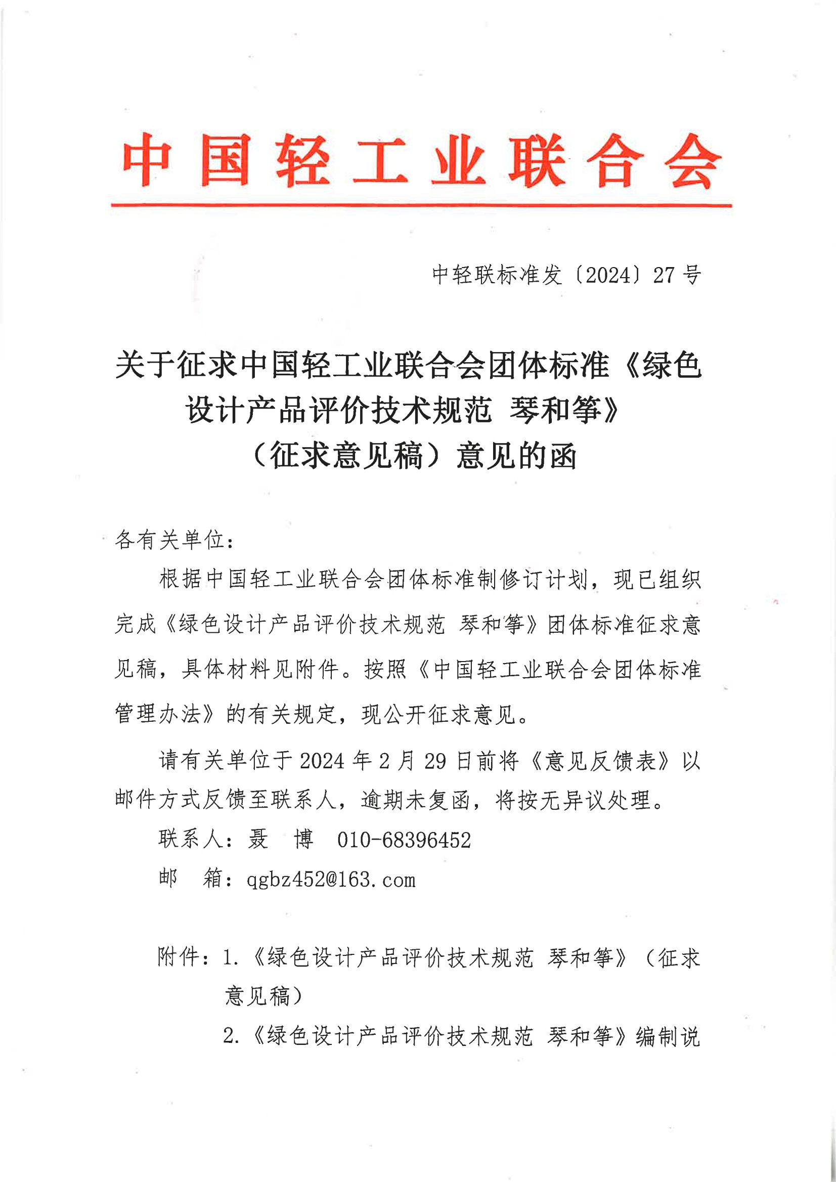 关于征求bv伟德国际体育1946团体标准《绿色设计产品评价技术规范 琴和筝》(征求意见稿)意见的函