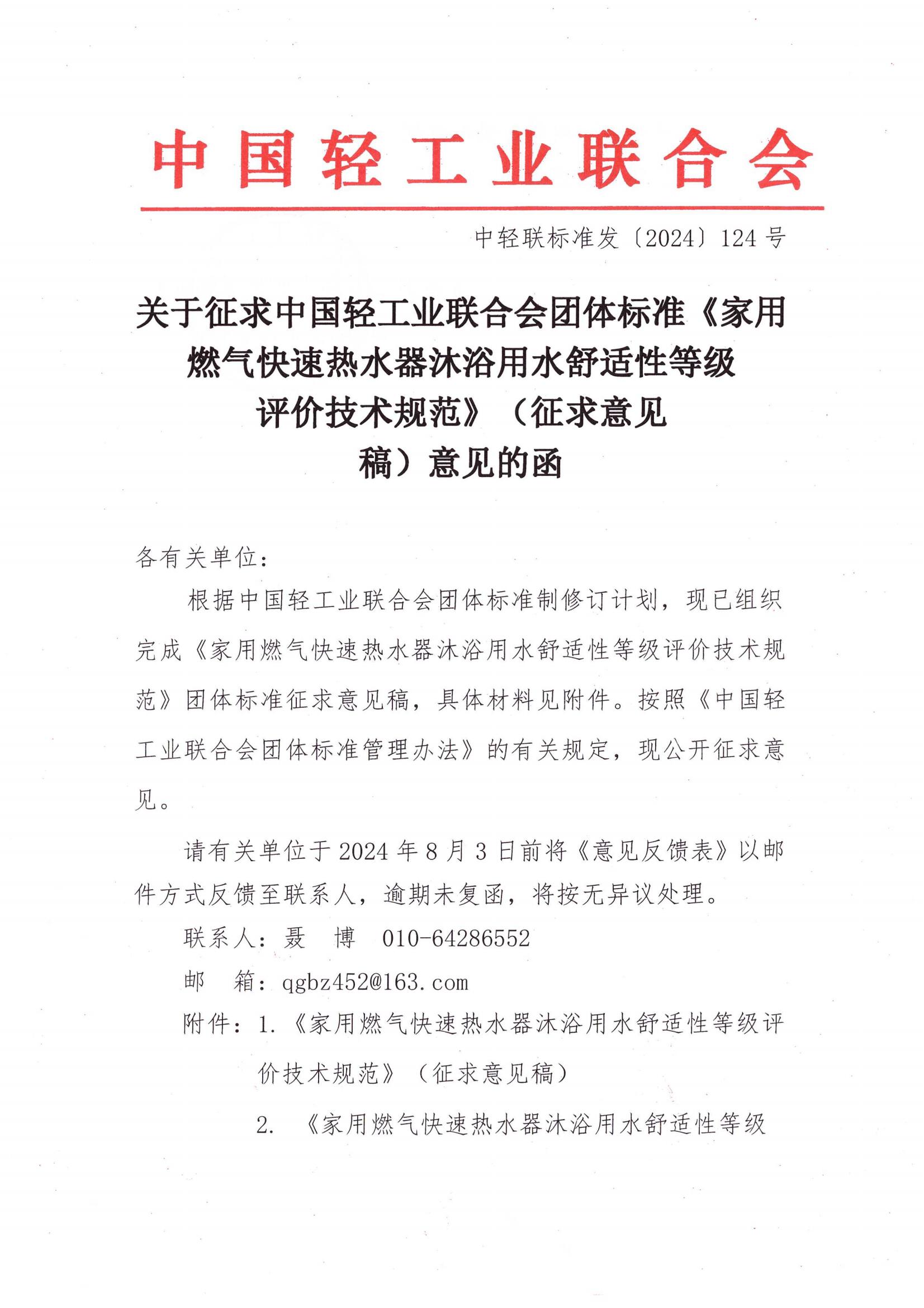 关于征求bv伟德国际体育1946团体标准《家用燃气快速热水器沐浴用水舒适性等级评价技术规范》(征求意见稿)意见的函