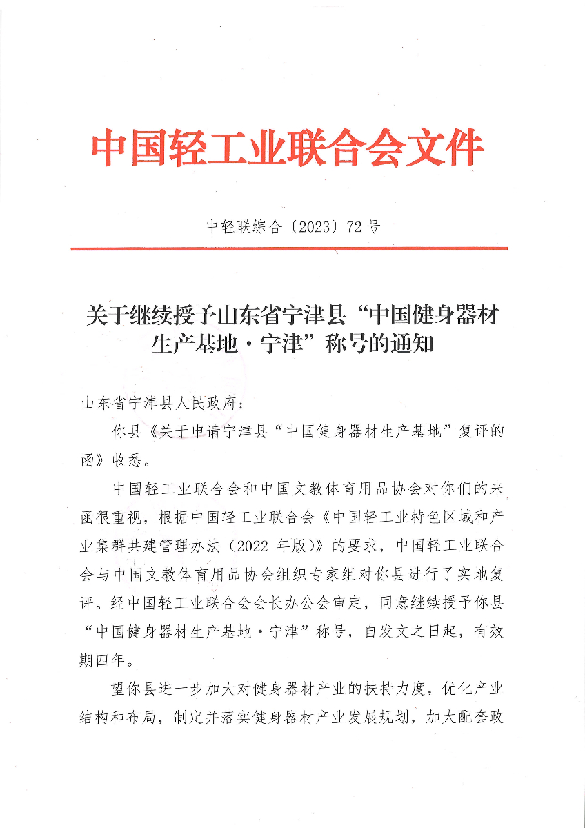 关于继续授予山东省宁津县“中国健身器材生产基地·宁津”称号的通知
